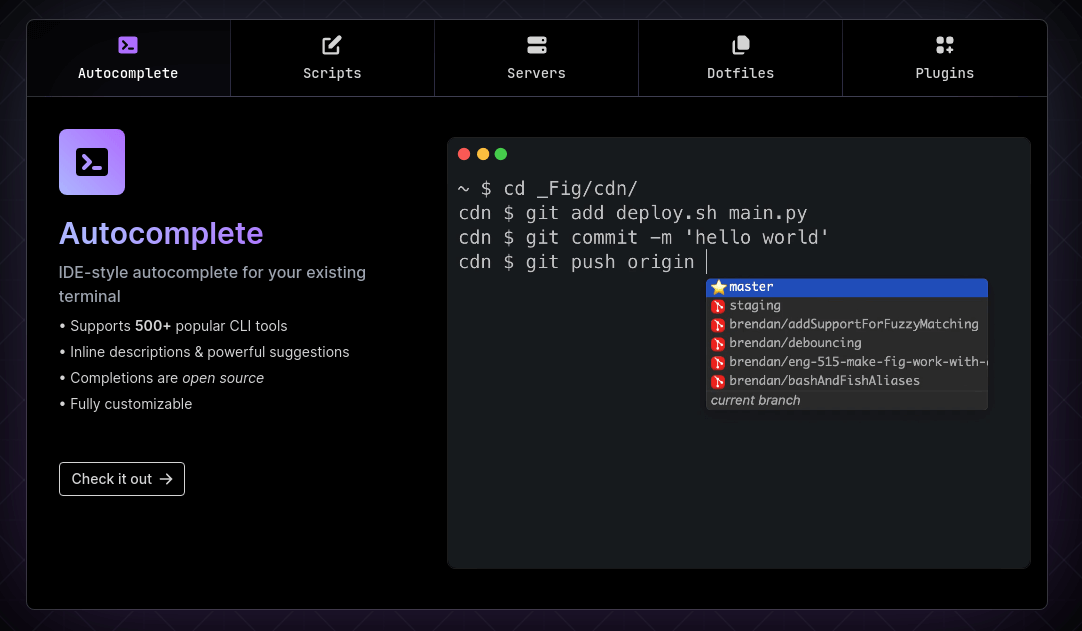 It makes things even better by giving you smart suggestions when you’re using popular command line tools like Git, npm, Docker, MongoDB Atlas, and the AWS CLI. These suggestions save you time by helping you type commands faster and avoiding typing the same stuff over and over again.