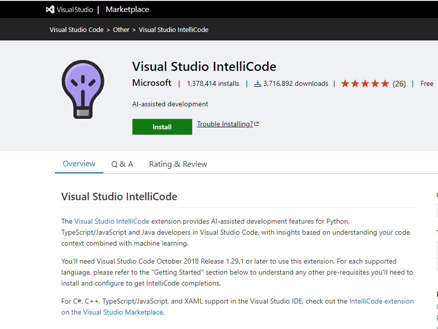 Intellicode is an extension that uses artificial intelligence. It helps the developer by providing code completion suggestions and supports many programming languages. It helps to write codes from the recommendations that are based on learning patterns from the numerous open-source GitHub repositories.